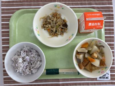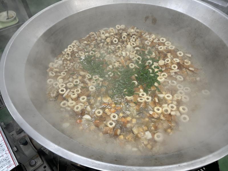 今日の汁ものは煮しめでした。だいこん、にんじん、しいたけ、さつまあげ、ちくわ、厚揚げなど具だくさんです。