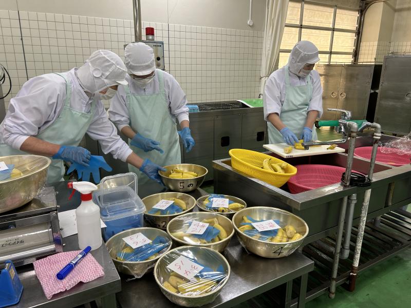 今日のデザートはバナナです。調理員さんたちは色が悪くならないように気をつけながら