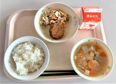 ごはん(ひゃくまん穀)、のっぺい汁、メンチカツ、れんこんサラダ、牛乳