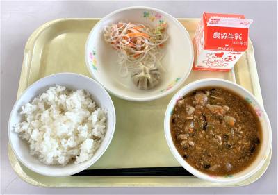 ごはん、マーボー大根、ショウロンポウ、春雨サラダ、牛乳