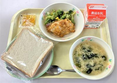 食パン、クリスピーチキン、ブロッコリーサラダ、卵スープ、みかんジャム、牛乳