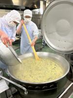 ハンバーグは中学校の分もあるので、スチームコンベクションでは焼けず…今日はボイル提供です。クラスごとの数を読んで上からトマトソースをかけます。穴水町のポタージュは具だくさん!じゃがいも、にんじん、豚肉、小松菜、コーン!優しい味わいのスープに仕上がりました。