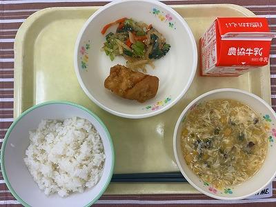 今日の給食は中華です。油淋鶏は、からあげにねぎダレをからめたものです。下味をつけ揚げた鶏肉に、調理場で手作りしたねぎダレをからめました。