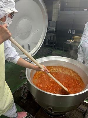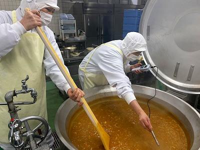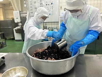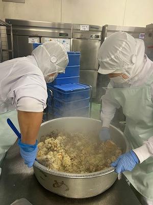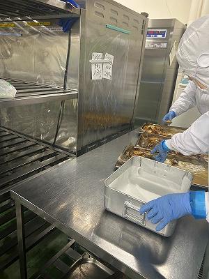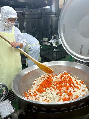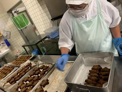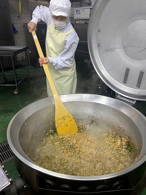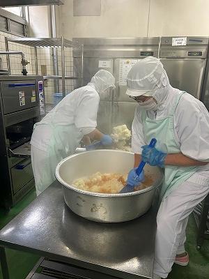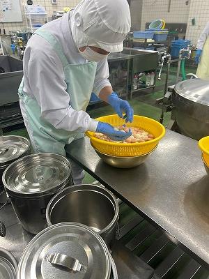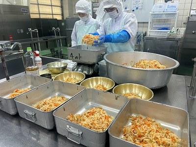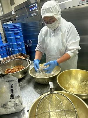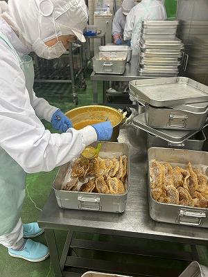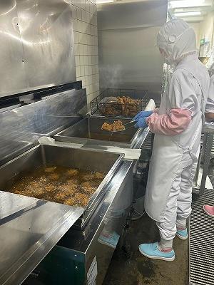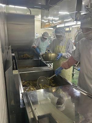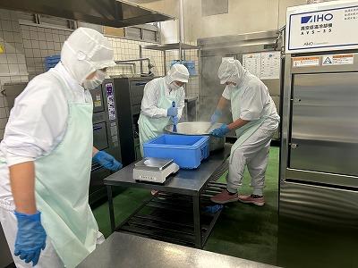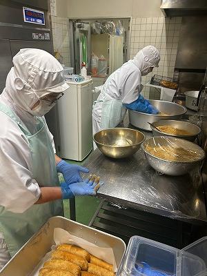 今日の主菜は、「ちくわの磯辺揚げ」です。1本のちくわを1/4にカットし、小麦粉と米粉、青のりで作った衣をつけ揚げます。1/4にカットすると800本以上になります。調理員さんは丁寧に衣をつけ、くっつかないように揚げています。ちくわをフライヤーに入れる人、温度を測って取り上げる人、数を数える人という風に仕事を分担して行っています。