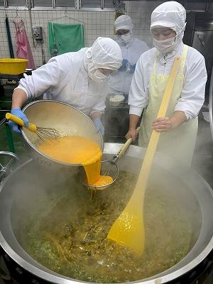 スープには、石川県産のたまごがたっぷり!ふわふわに仕上がるようにとろみをつけてから、ザルでこして卵を入れています。
