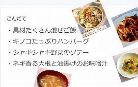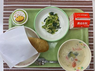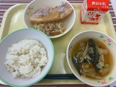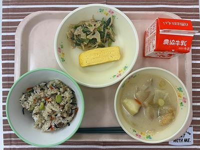 今日は、「ゆうこりん杯」で優勝したメニューで調理場の都合で、実現できなかったメニューです。具だくさん混ぜごはんは、ひじきや鶏肉、えだまめ、しめじなどたくさん具が入っています。給食時間には、優勝者の碓井瑛大さんがみんなの前で、考えるときに気をつけたことについて話してくれました。とてもおいしく彩りもよく、みんな完食でした!