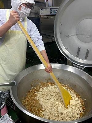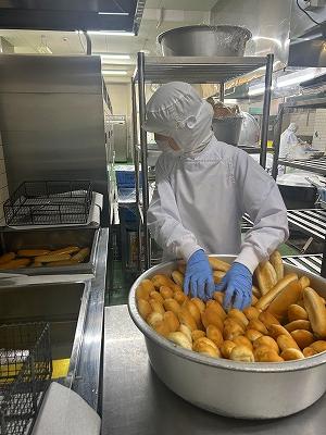 今日は久しぶりの「きなこ揚げパン」です。穴水町は冷凍のパンを使用しているので、袋から出すことから始ま枝ります。350個のパンをあけ、油で揚げて、きなこをまぶします。手間のかかる作業ですが、子どもたちの好きなメニューなので調理員さんたちはがんばってくれました(^▽^)