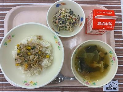 今日は、「ポークペッパーライス」です。豚肉ととうもろこし、ねぎをバターやしょうゆ、オイスターソースで味付けしました。あらびきこしょうも入っています。子どもたちが好きな味付けに仕上がりました。