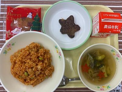 今日は2学期最後の給食です。クリスマスイブということもあり、今日はクリスマスの行事食です。