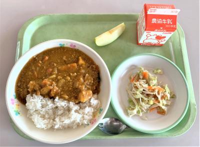 秋野菜カレー(穴水町産さつまいも、かぼちゃ使用)、ごま酢和え、りんご(穴水町産)