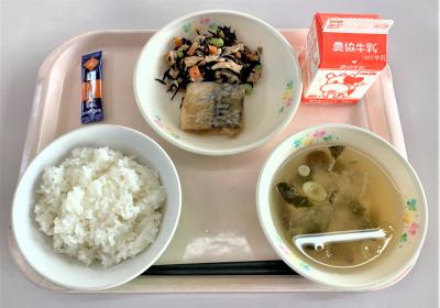 ごはん(特別栽培米:穴水町甲地区産)、サバのみそ煮、大豆の磯煮、なめこ汁、ふりかけ、牛乳