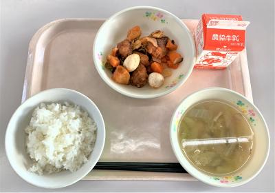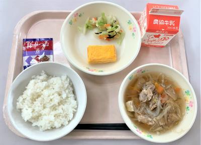 ごはん(特別栽培米:穴水町甲地区産)、すき焼き風煮、厚焼き卵、塩こんぶ和え、ふりかけ、牛乳