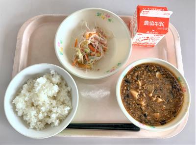 ごはん(特別栽培米:穴水町甲地区産)、マーボー豆腐、春雨サラダ、牛乳