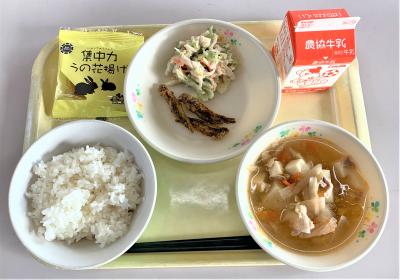 ごはん(特別栽培米:穴水町甲地区産)、鰯のから揚げ、かみかみサラダ、チゲ風みそ汁、うの花スナック、牛乳