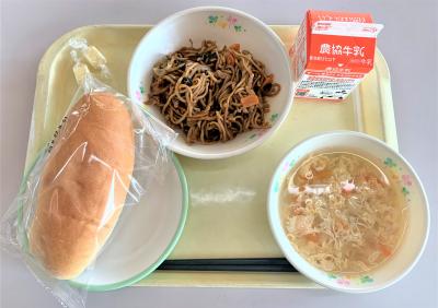 こっぺぱん、ソース焼きそば、卵スープ、ひと口チーズ、牛乳