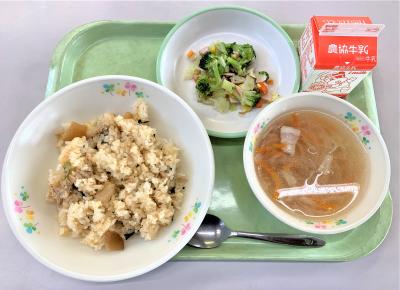 キムタクごはん(特別栽培米使用)、せん切りスープ、ブロッコリーサラダ、牛乳