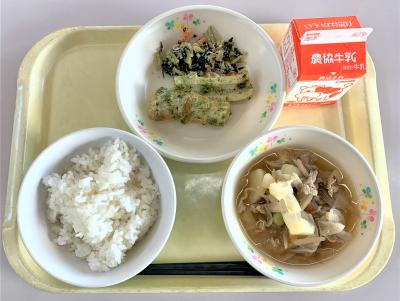ごはん(特別栽培米)、ちくわの磯辺揚げ、小松菜としらすのごま和え、肉じゃが、牛乳