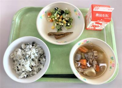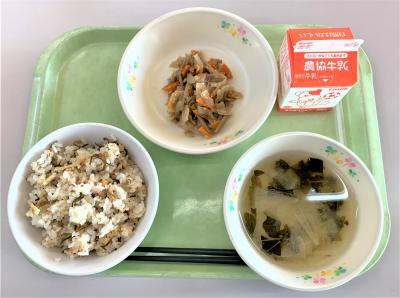 わかめごはん、炒り鶏、いわしの唐揚げ、チーズ入りお浸し、牛乳