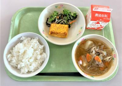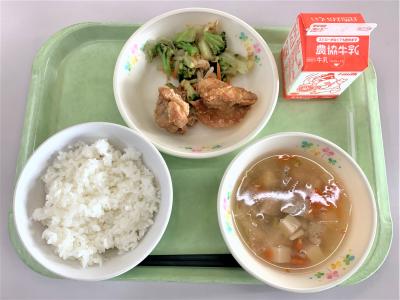 ごはん、鶏の米粉揚げ、おかか和え、のっぺい汁、牛乳