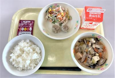 ごはん、シュウマイ、大根サラダ、鶏のすき焼き風煮、しそかつおふりかけ、牛乳