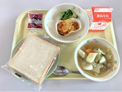 食パン、ラザニア風、添え野菜(ブロッコリー)、ポトフ、豆チョコクリーム、牛乳