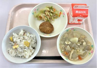 栗ごはん(穴水町産栗使用)、メンチカツ、お浸し、けんちん汁、牛乳