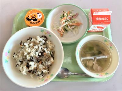 ビーフライス、豆腐スープ、春雨サラダ、ハロウィンデザート、牛乳