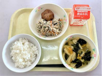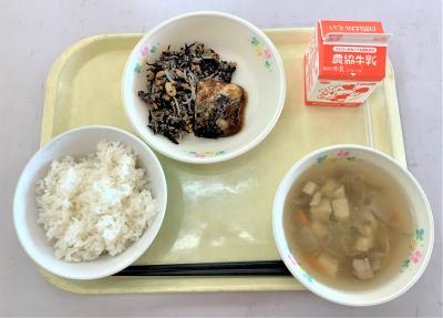 ごはん、サバのしょうが煮、ひじきの炒り煮、鶏とごぼうのすまし汁、牛乳