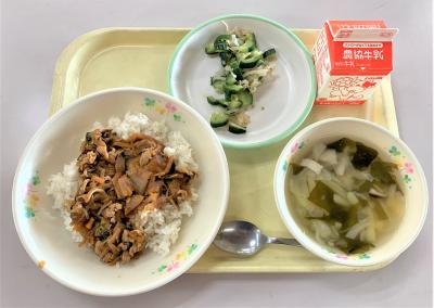 豚肉のピリ辛丼、わかめスープ、きゅうりのピリから和え、牛乳