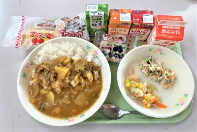 ジビエカレー(里山食品さんのイノシシ肉使用)、副菜バイキング(かみかみサラダ・コーンソテー)