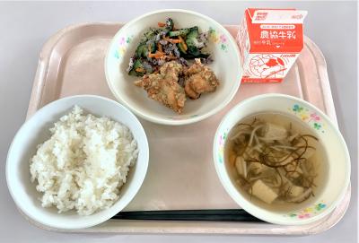 ごはん、鶏の磯辺揚げ、ゆかり和え、もずくスープ、牛乳