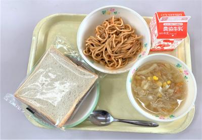 食パン、夏野菜のミートソーススパゲティ―、コンソメスープ、牛乳