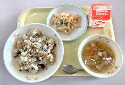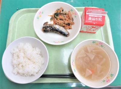 ごはん、いわしのみぞれ煮、切干大根の煮物、のっぺい汁、牛乳