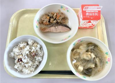 さつまいもごはん、魚の麹焼き、五目きんぴら、みそ汁、牛乳