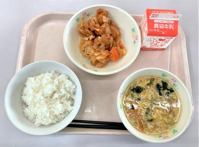 ごはん、鶏と野菜のケチャップ炒め、中華風コーンスープ、牛乳