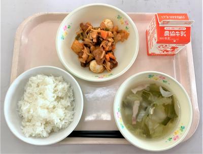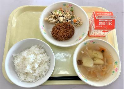 ごはん、飛び魚のかば焼き風、ひじきの炒め煮、みそ汁、牛乳