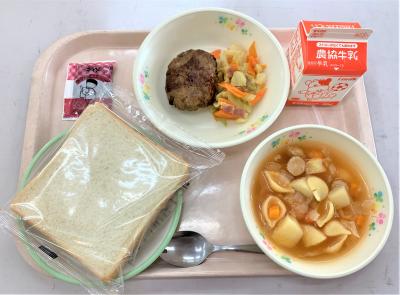 食パン、ハンバーグ、野菜ソテー、ミネストローネ、チョコクリーム、牛乳