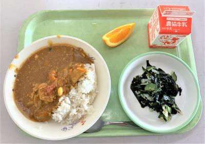 ビーンズカレー、チョレギサラダ、オレンジ、牛乳