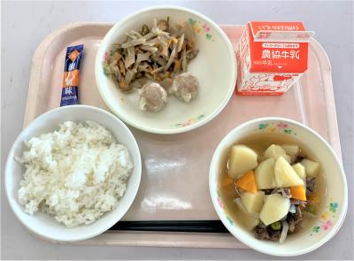 ごはん、肉じゃが、シュウマイ、五目きんぴら、ふりかけ、牛乳