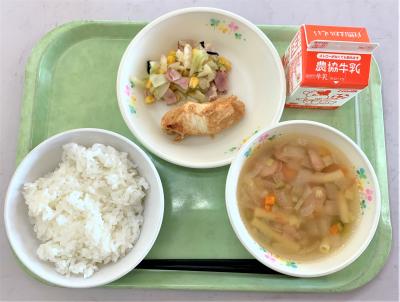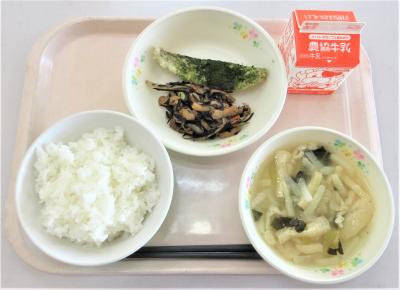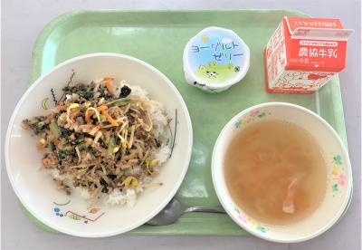 ツナごはん、すまし汁、ビーンズサラダ(石川県産発芽大豆使用)、牛乳