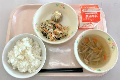 ごはん、ショウロンポウ、五目ビーフン、鶏とごぼうのすまし汁、牛乳