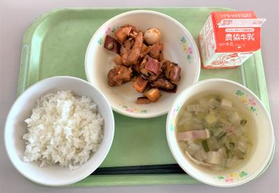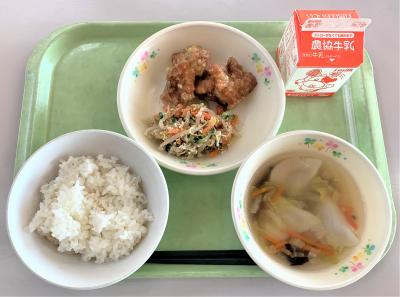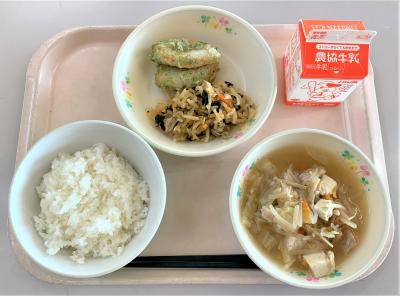 ごはん、笹かまの磯辺揚げ、切干大根のピリ辛炒め、とり野菜、牛乳