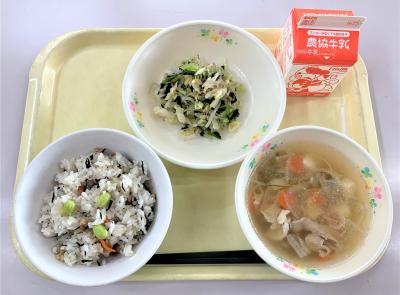 ひじきごはん、豚汁、おかか和え、牛乳