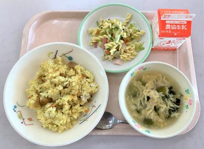 カレーピラフ、卵スープ、マカロニサラダ、牛乳