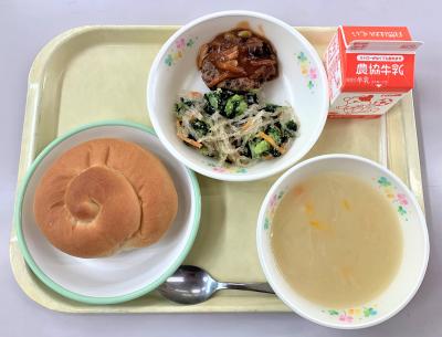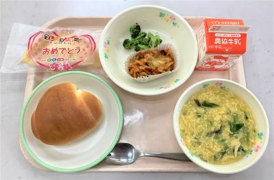 バターロール、ラザニア風、ブロッコリー和え、中華風コーンスープ、お祝いクレープ、牛乳