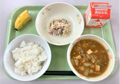 ごはん、豆腐のカレー煮、切干大根のごまマヨサラダ、バナナ、牛乳