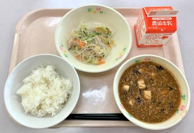 ごはん、マーボー豆腐、中華和え、牛乳