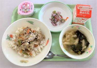 豚丼、みそ汁、ゆかり和え、みそ汁、牛乳、お祝いいちごゼリー