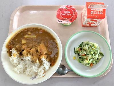 チキンカレー、コールスローサラダ、りんごゼリー、牛乳