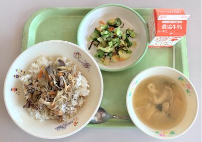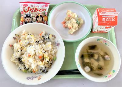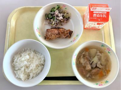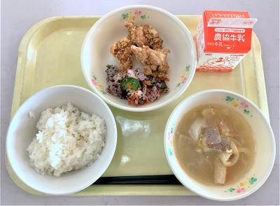 ごはん、鶏のから揚げ、ゆかり和え、けんちん汁、牛乳